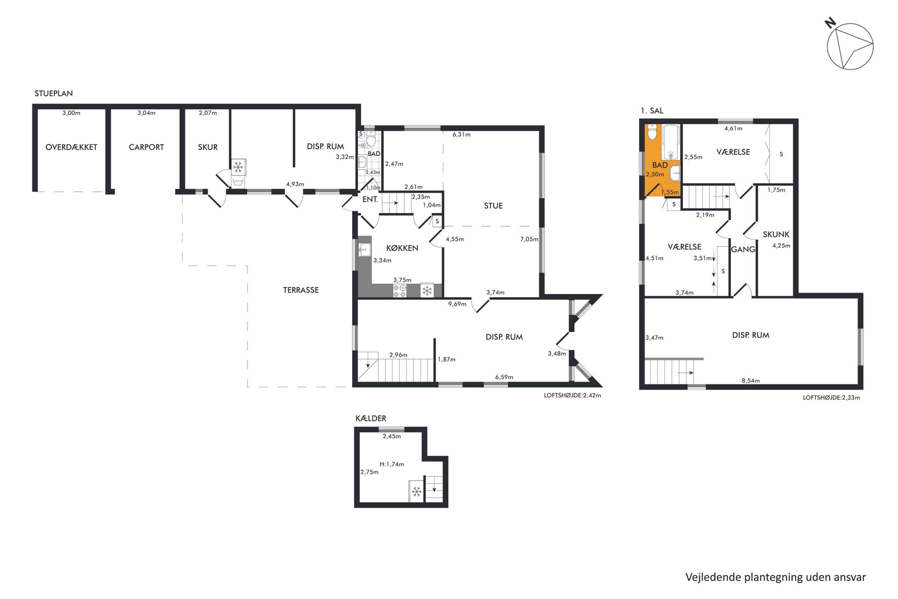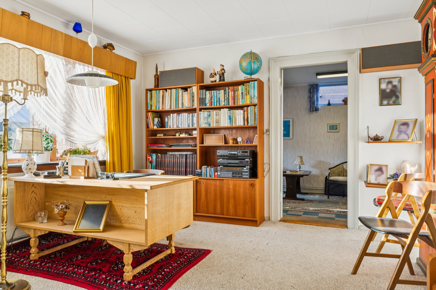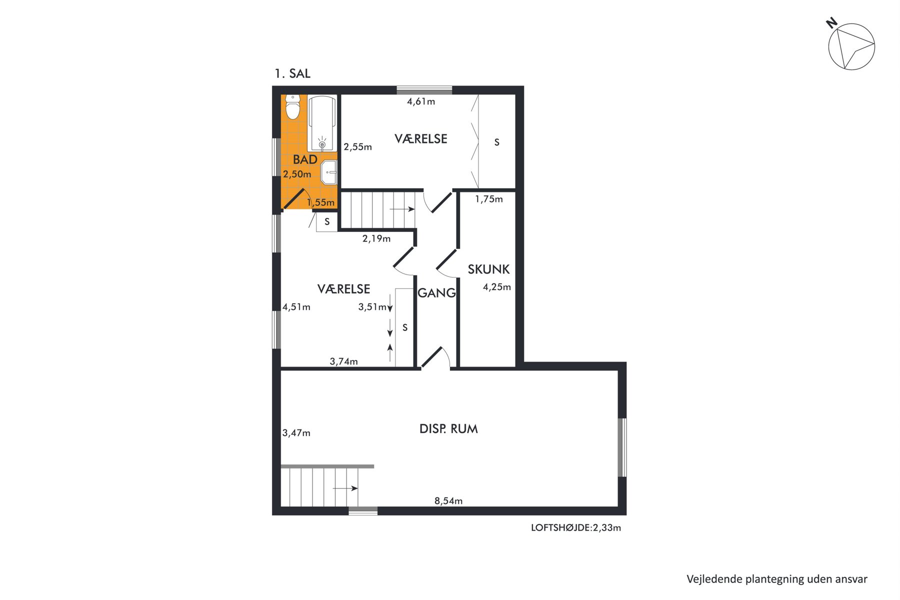 På 1. salen finder du endnu et badeværelse med gulvvarme og badekar, to gode værelser og et uudnyttet skunkrum. Derudover rummer førstesalen et fantastisk rum på ca. 40 m², som tidligere var en del af skomagerforretningen – et oplagt sted til hobbyrum, kontor eller måske et atelier.