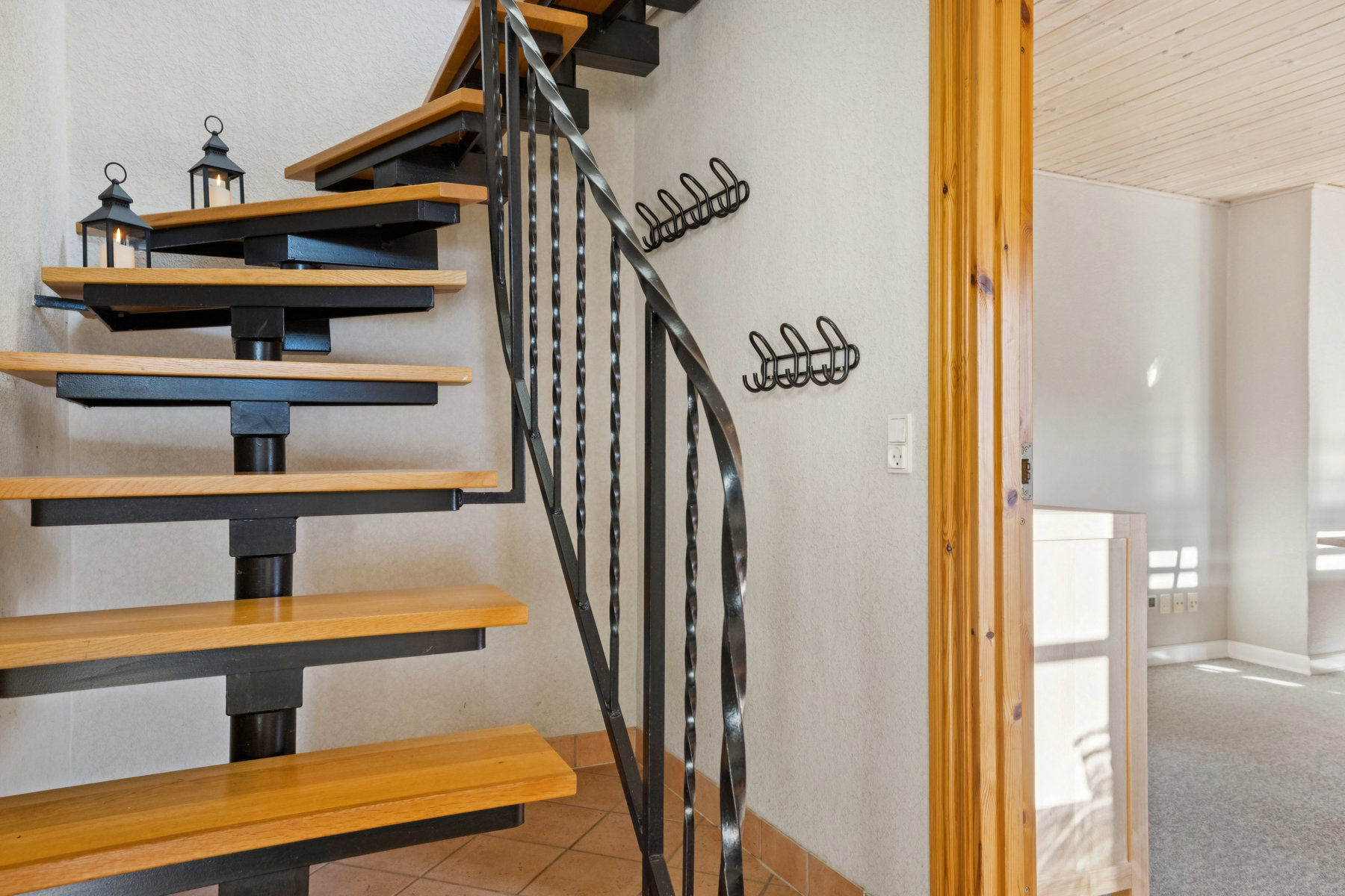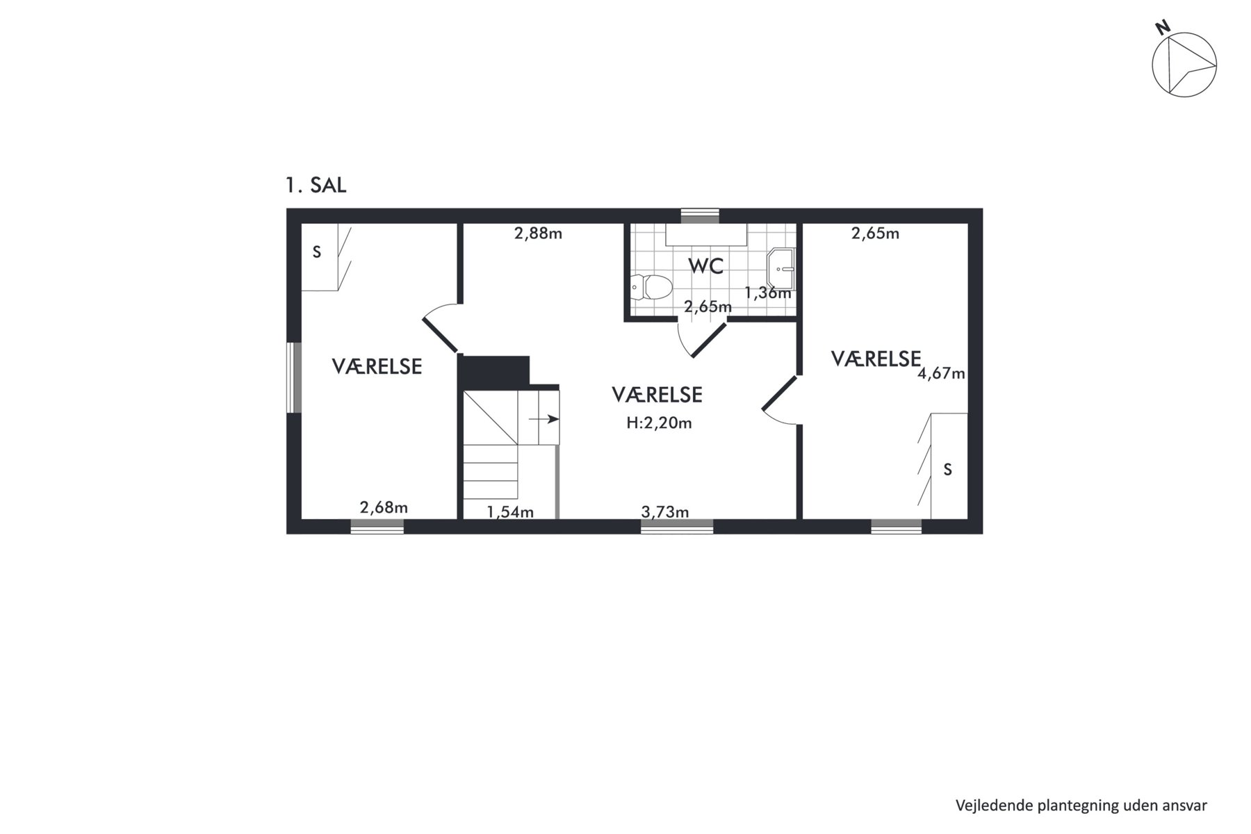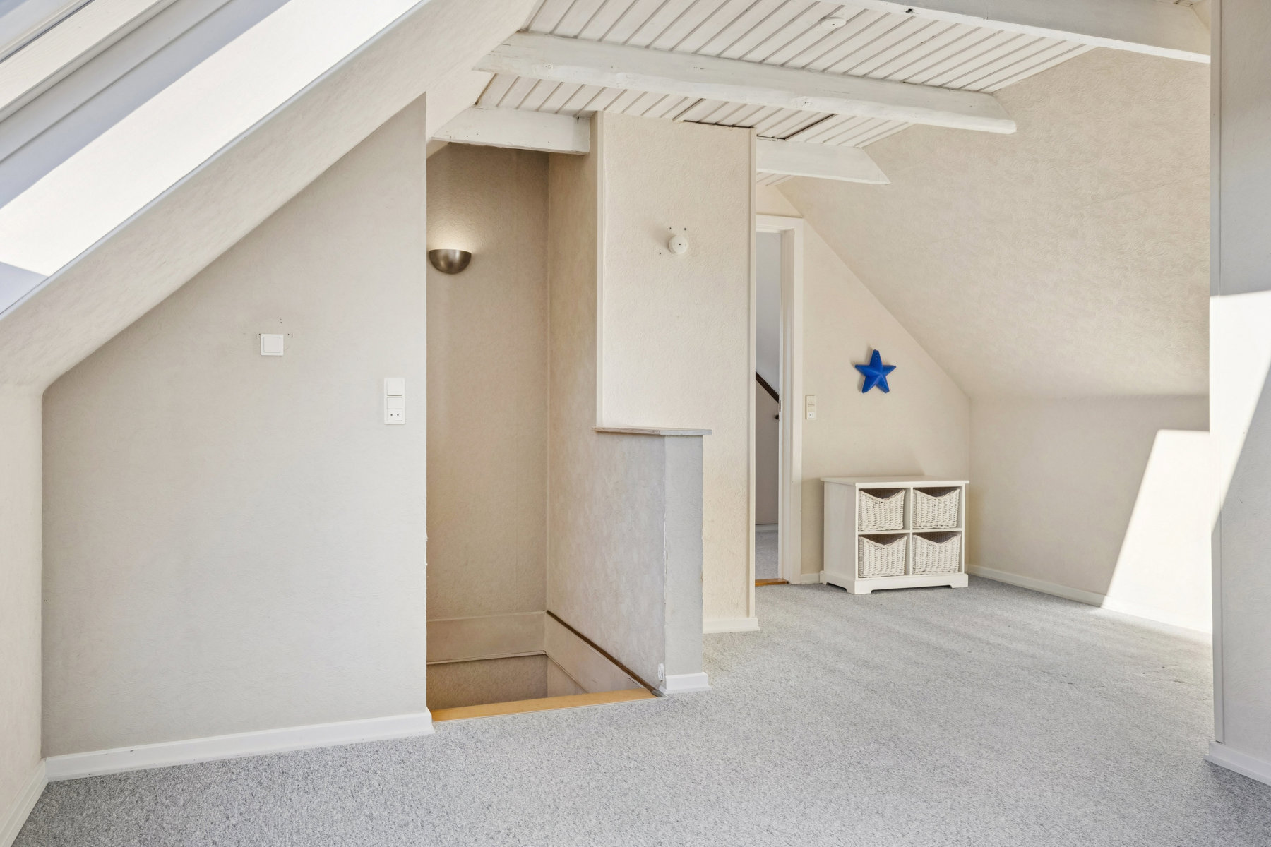 I entréen fører en trappe op til førstesalen, der er indrettet med en stor, møblerbar repos, et badeværelse og to soveværelser. Husets størrelse og indretning passer rigtig fint til en børnefamilie, og I kan skabe en god børneafdeling på førstesalen.