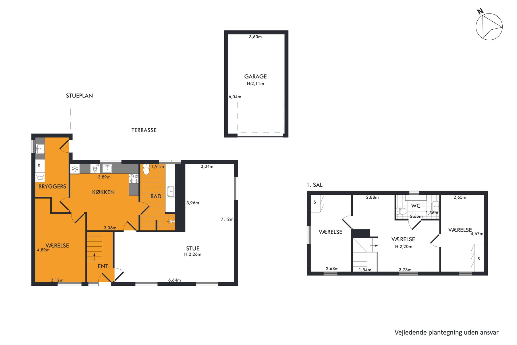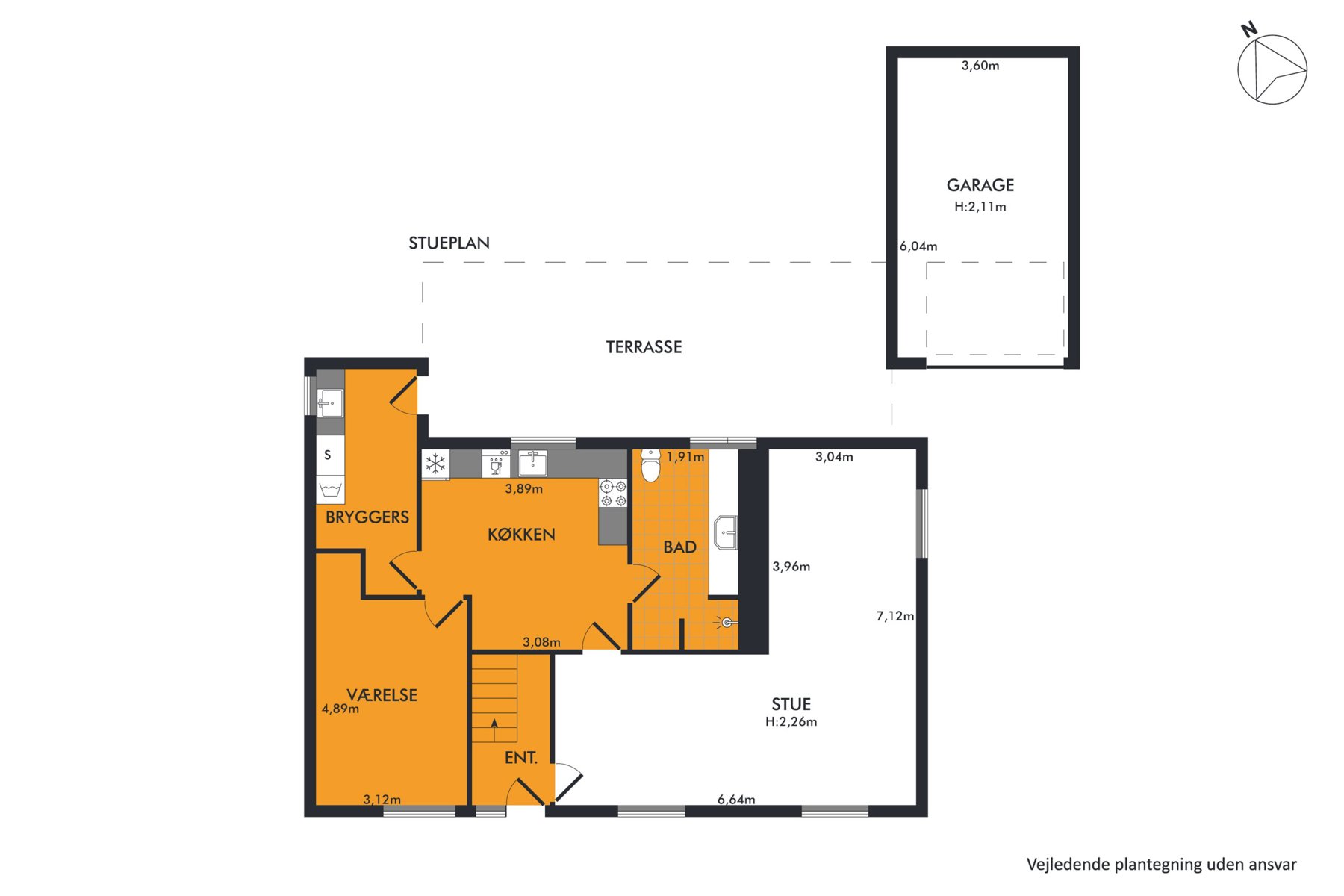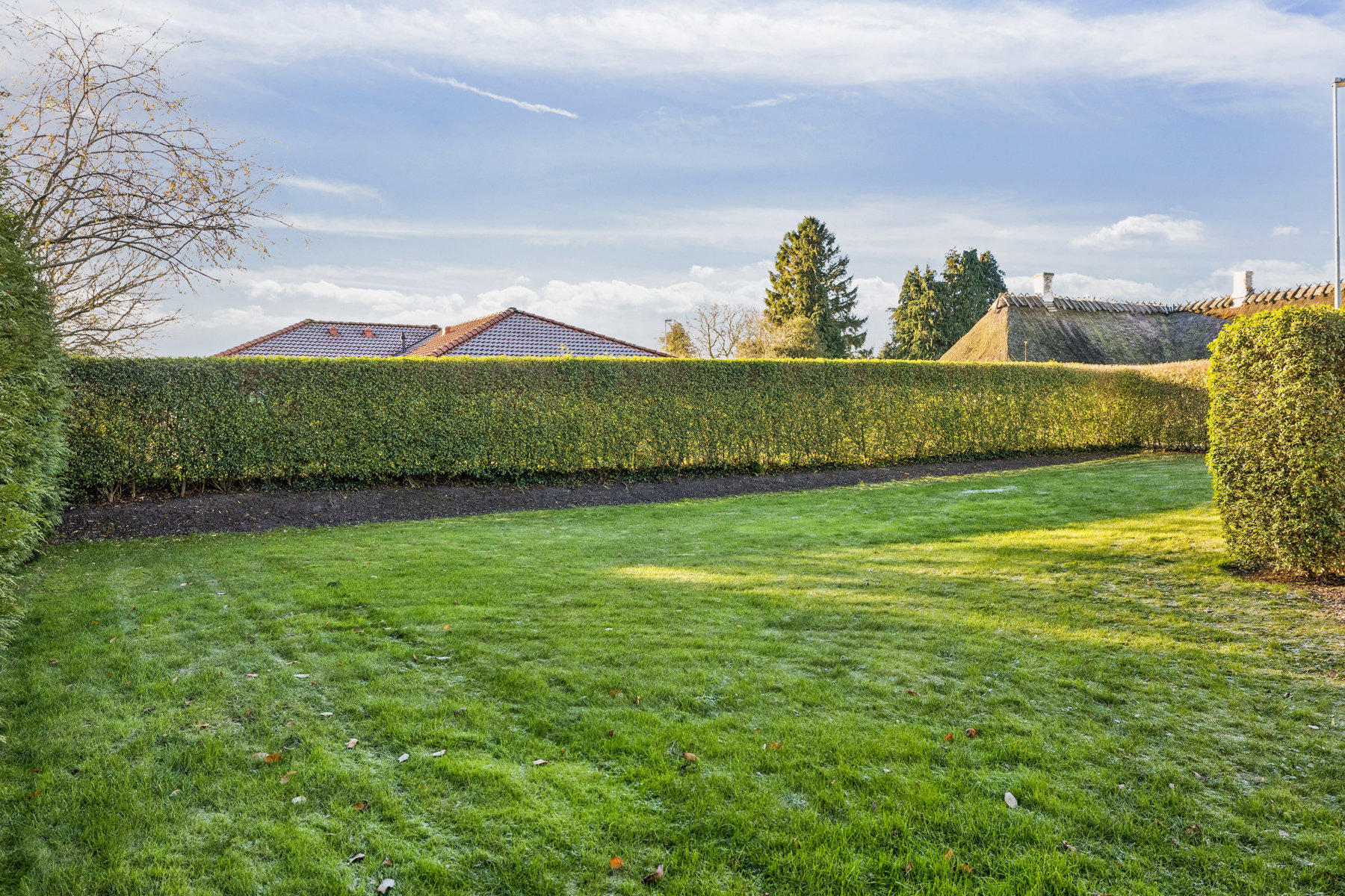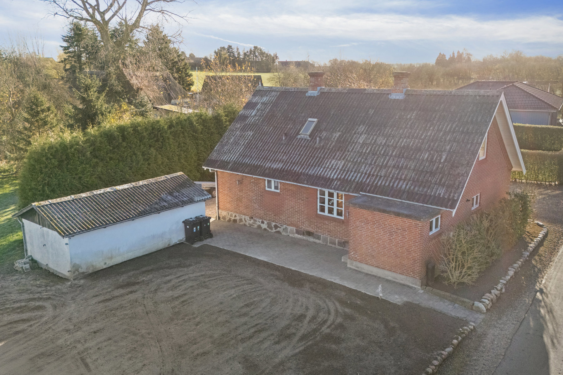 Der er masser af muligheder på husets store grund. Syd for huset er der anlagt en lille, lukket have, og på den anden side er der terrasse og et stort friområde udlagt med muldjord. Her kan I anlægge en større have, flere terrasser, en køkkenhave måske eller noget fjerde. Det er et blankt lærred, som det er op til jer at udfylde. Endelig får I også en garage.