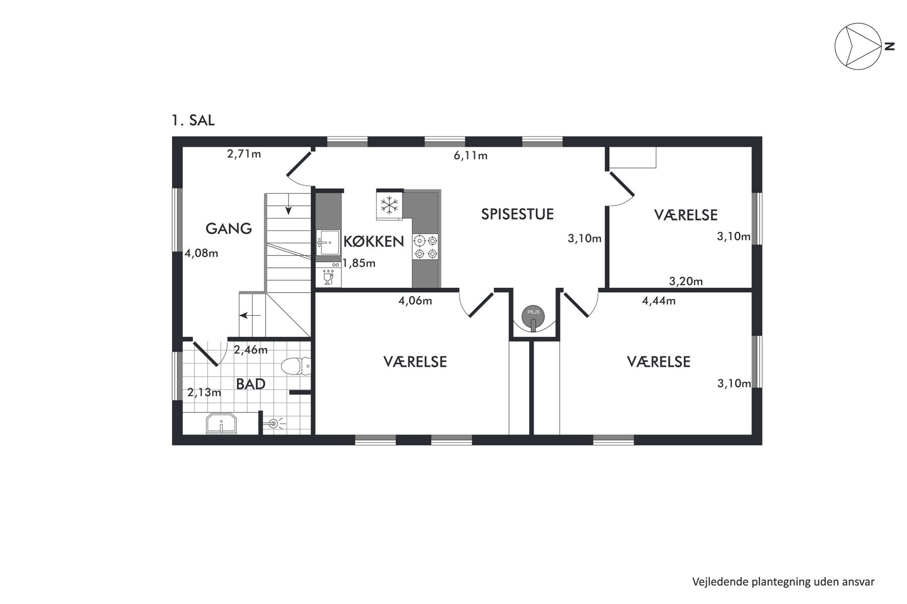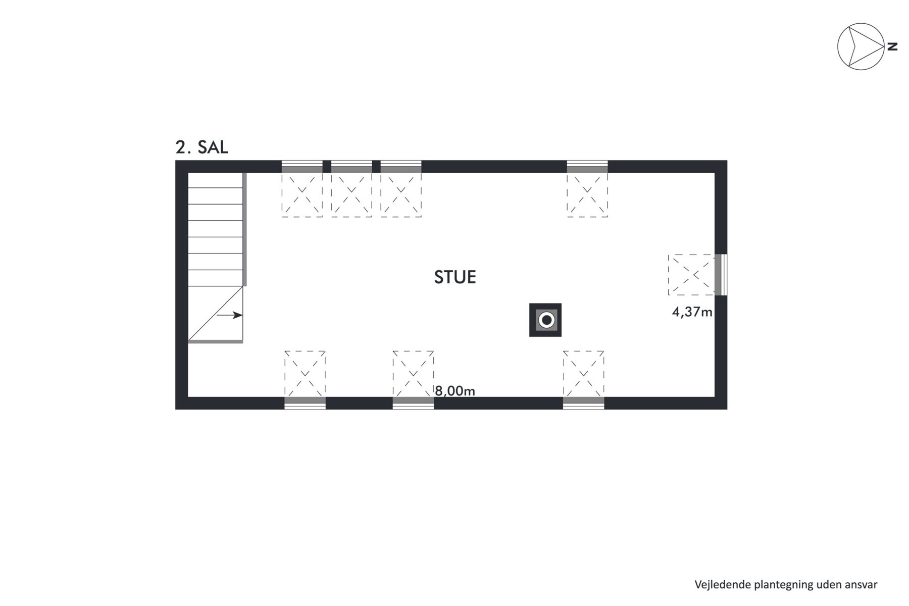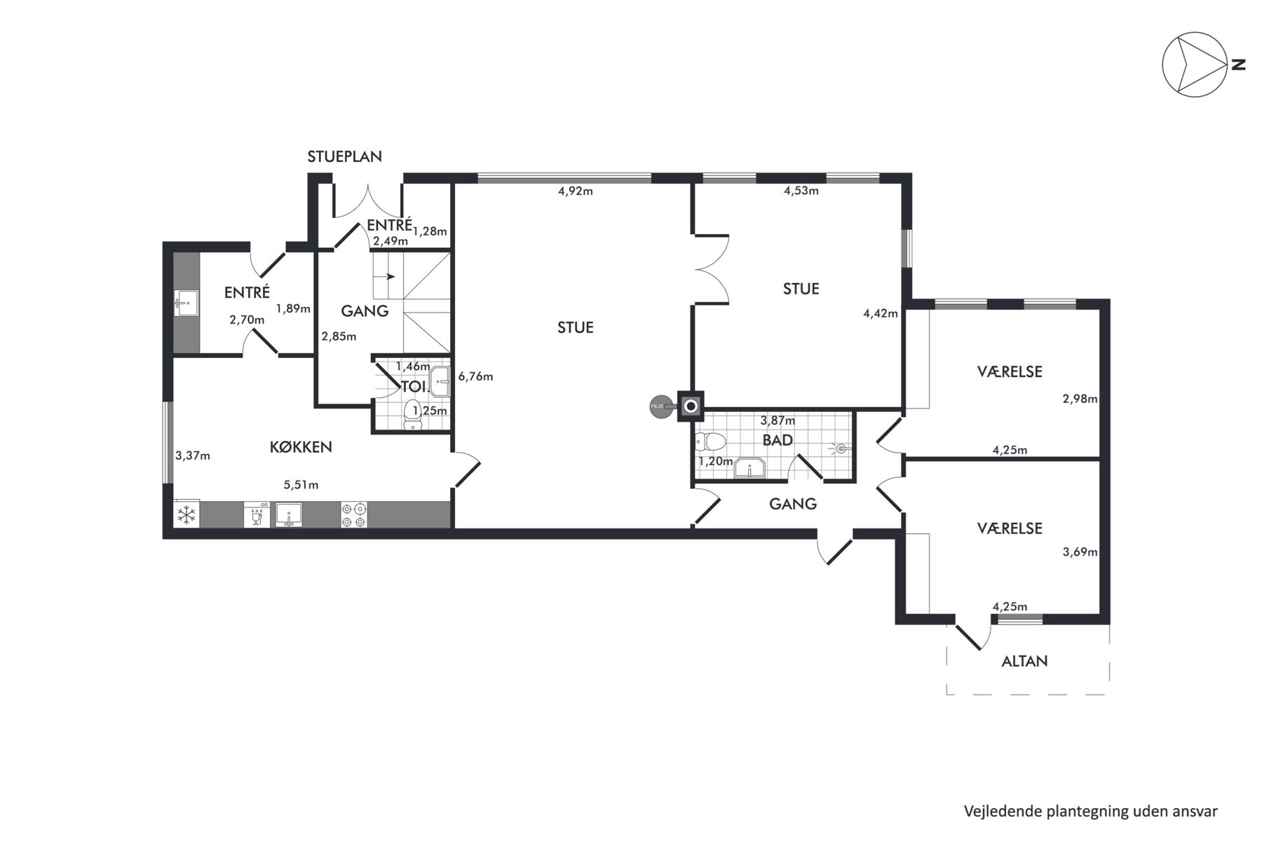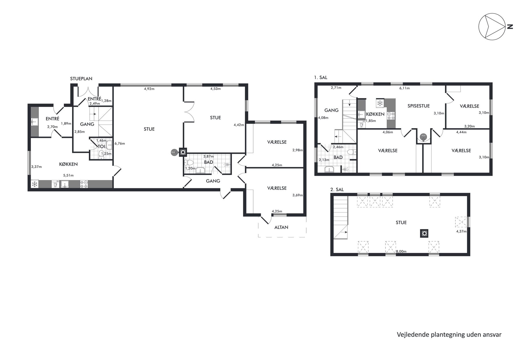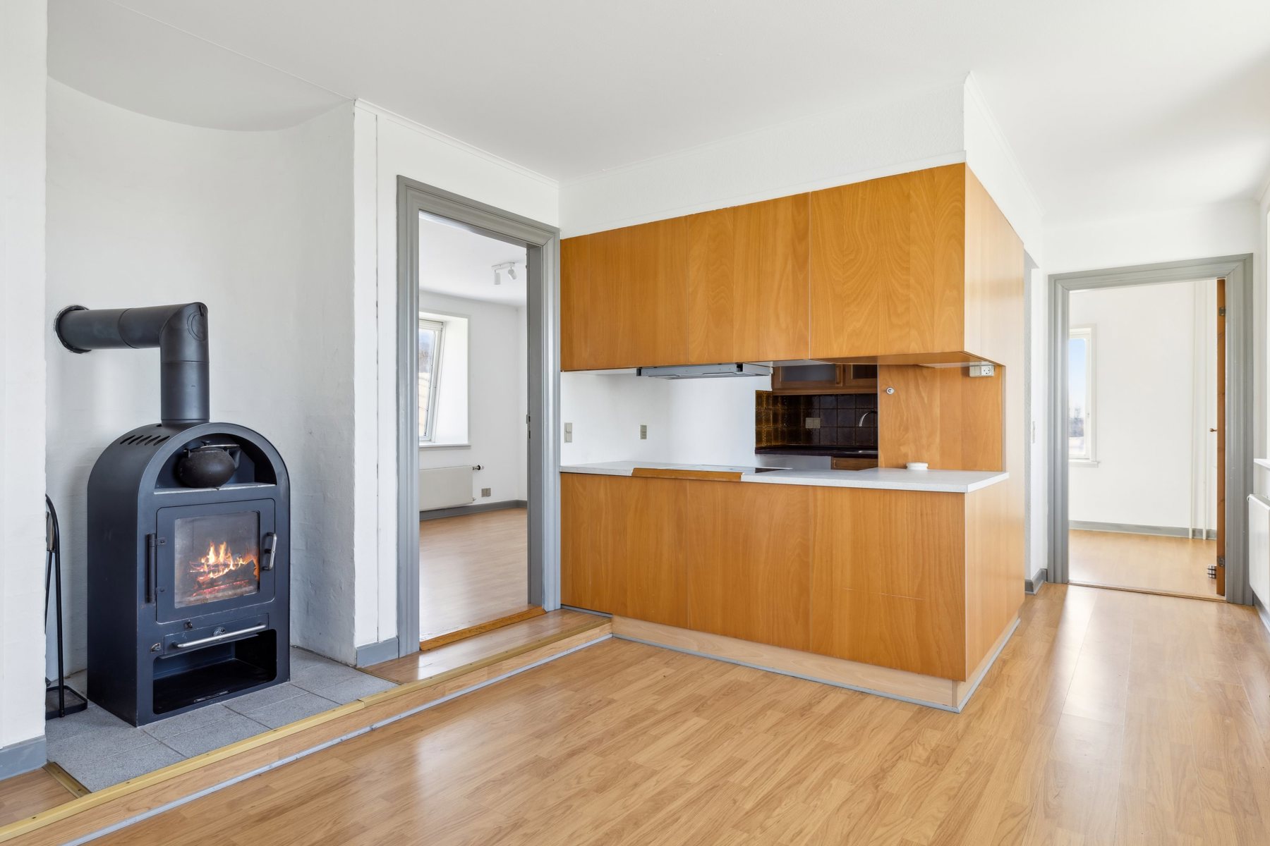 Boligen fordeler sig over tre plan og er løbende vedligeholdt. I stueetagen finder du et stort spisekøkken, to charmerende stuer en suite, to værelser – det ene med udgang til altan – samt et badeværelse og et separat toilet. Førstesalen byder på tre værelser, et rummeligt køkken-alrum med brændeovn samt et badeværelse. Herfra leder en trappe videre op til anden sal, hvor en stor stue med loft til kip og fritlagte bjælker skaber en hyggelig atmosfære.