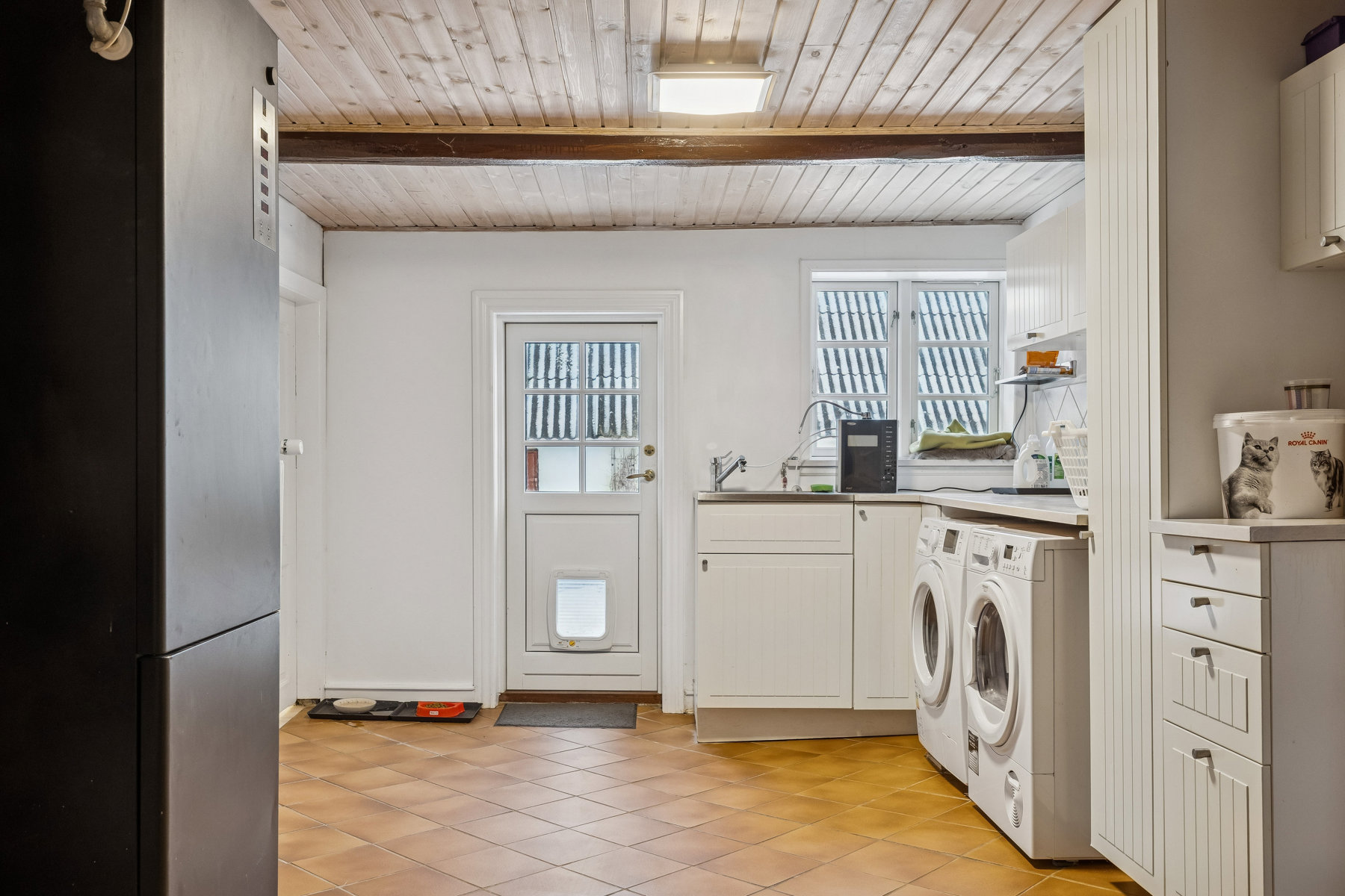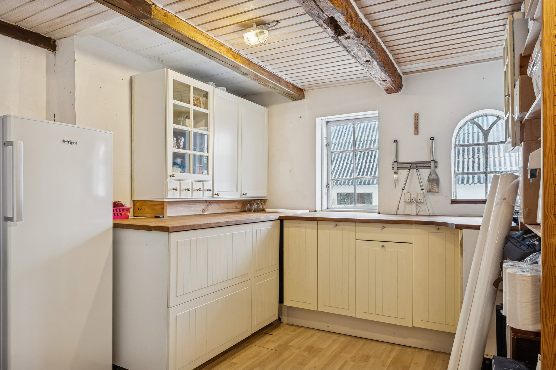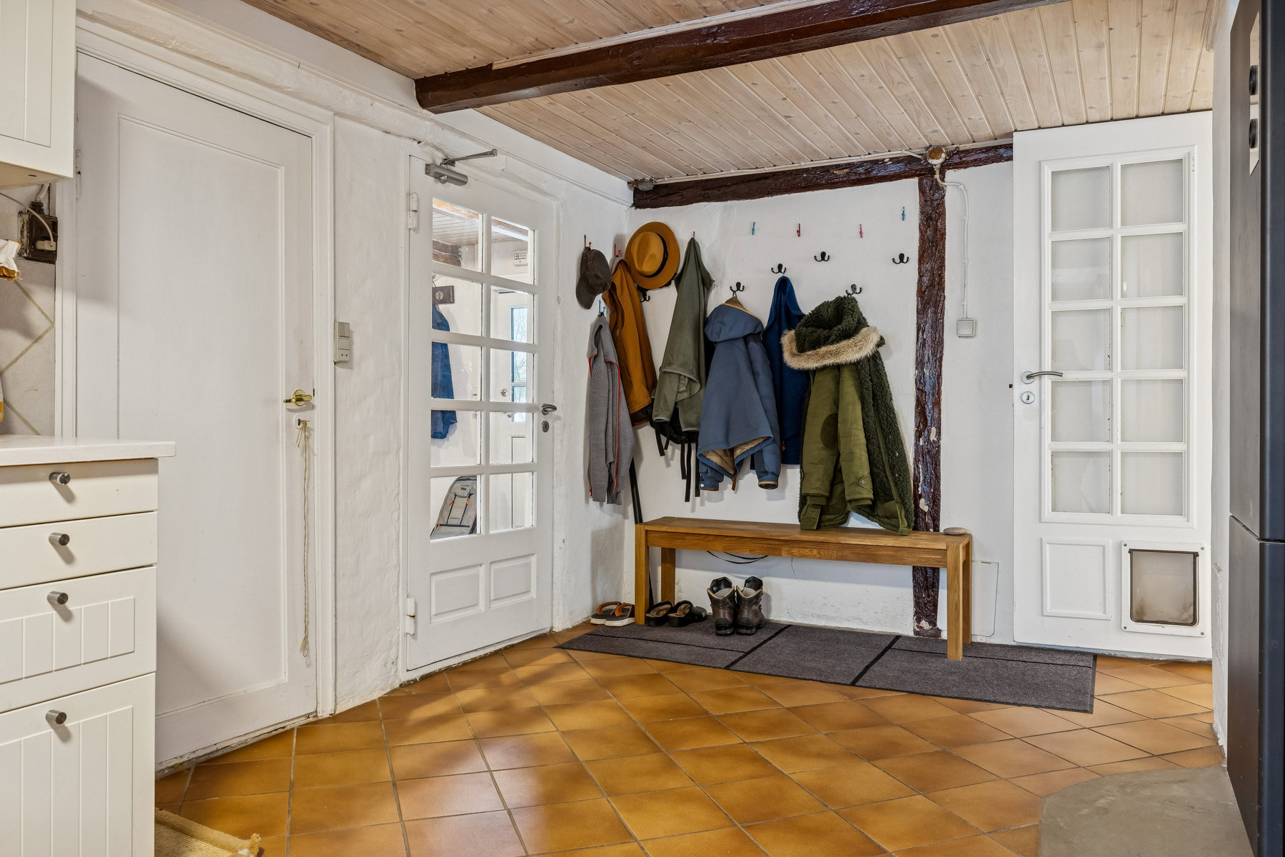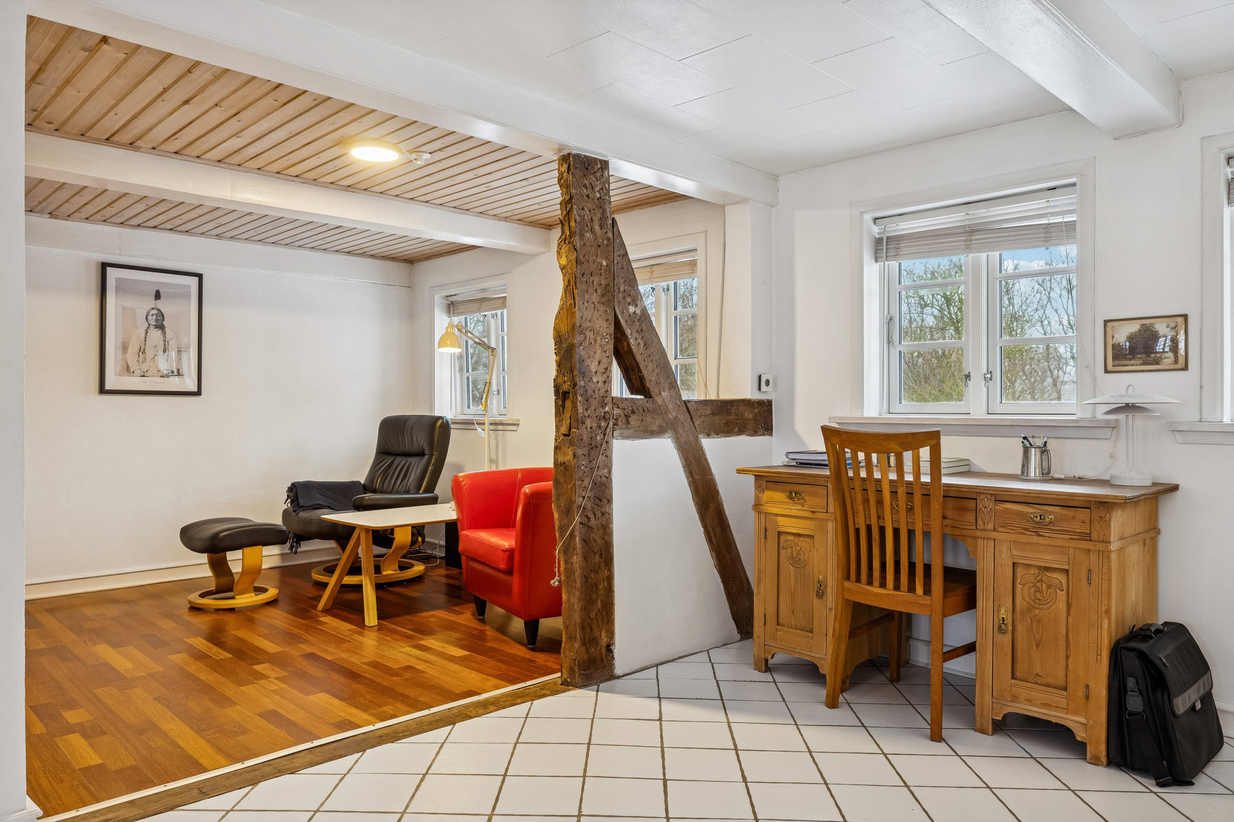 Indvendigt fremstår boligen hyggelig og stemningsfuld med synlige loftsbjælker og den helt rette landlige atmosfære. Planløsningen er rummelig og fleksibel med to køkkener, to badeværelser, fire soveværelser, spisestue, to stuer og bryggers. Hertil kommer en førstesal med et stort soveværelse samt et uudnyttet loftsrum. Indretningen giver gode muligheder for den pladskrævende familie, for flere generationer under samme tag eller for dig, der ønsker at kombinere bolig og liberalt erhverv.
