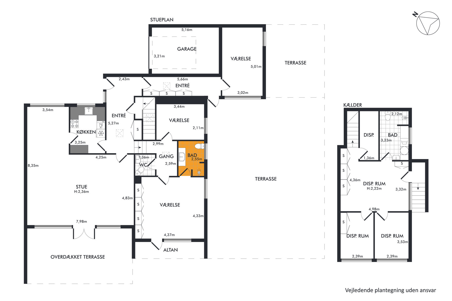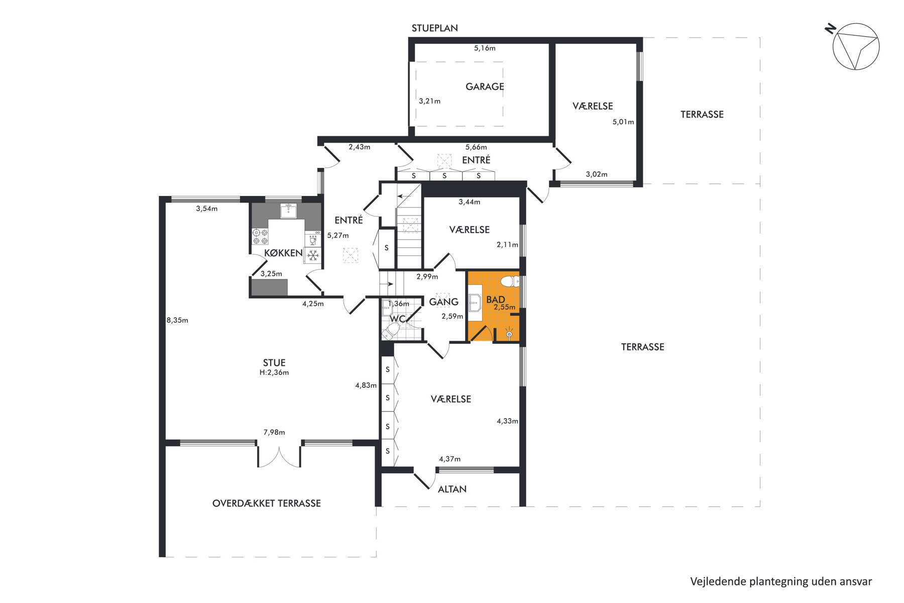 Stuen og køkkenet er et oplagt sted at starte. Her er både mulighed for at lave køkken-alrum og for at sammenlægge køkkenet med stuen og derved skabe et flot, åbent opholdsrum. I bunden af stuen er der udgang til den overdækkede terrasse, hvilket skaber en udendørs forlængelse af rummet. Der er desuden mulighed for at sammenlægge en del af entréen med køkkenet og derved skabe endnu mere dynamik i huset.