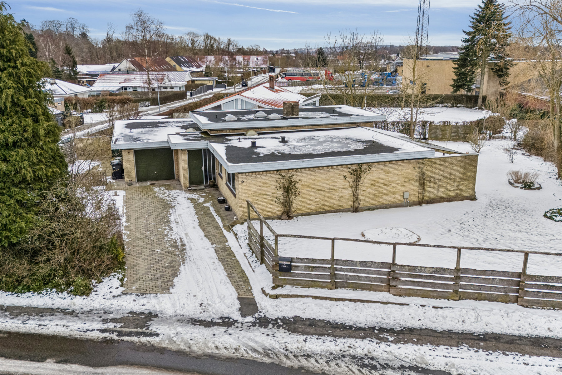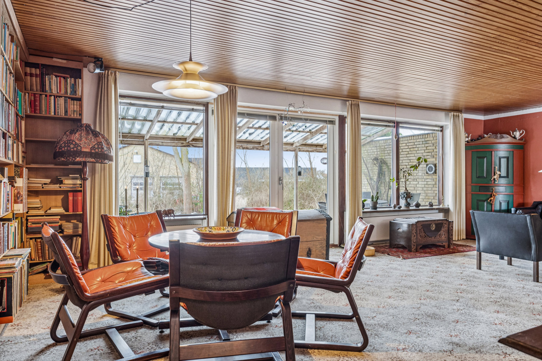 Det er rigtig spændende rammer, I får at arbejde med her få skridt fra Margrethelund-skoven centralt i Svendborg. Her ligger denne spændende etplansvilla med en anderledes indretning og en meget original arkitektur bestående af tre sammenførte bygninger med et samlet boligareal på 172 m2. Hertil kommer en stor kælder og en integreret garage samt et dejligt udemiljø med en stor, lukket gårdhave og en ligeledes stor, overdækket terrasse.