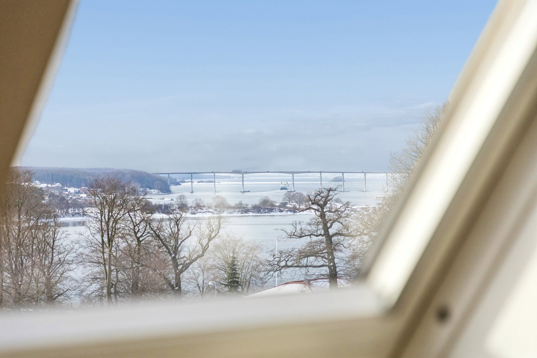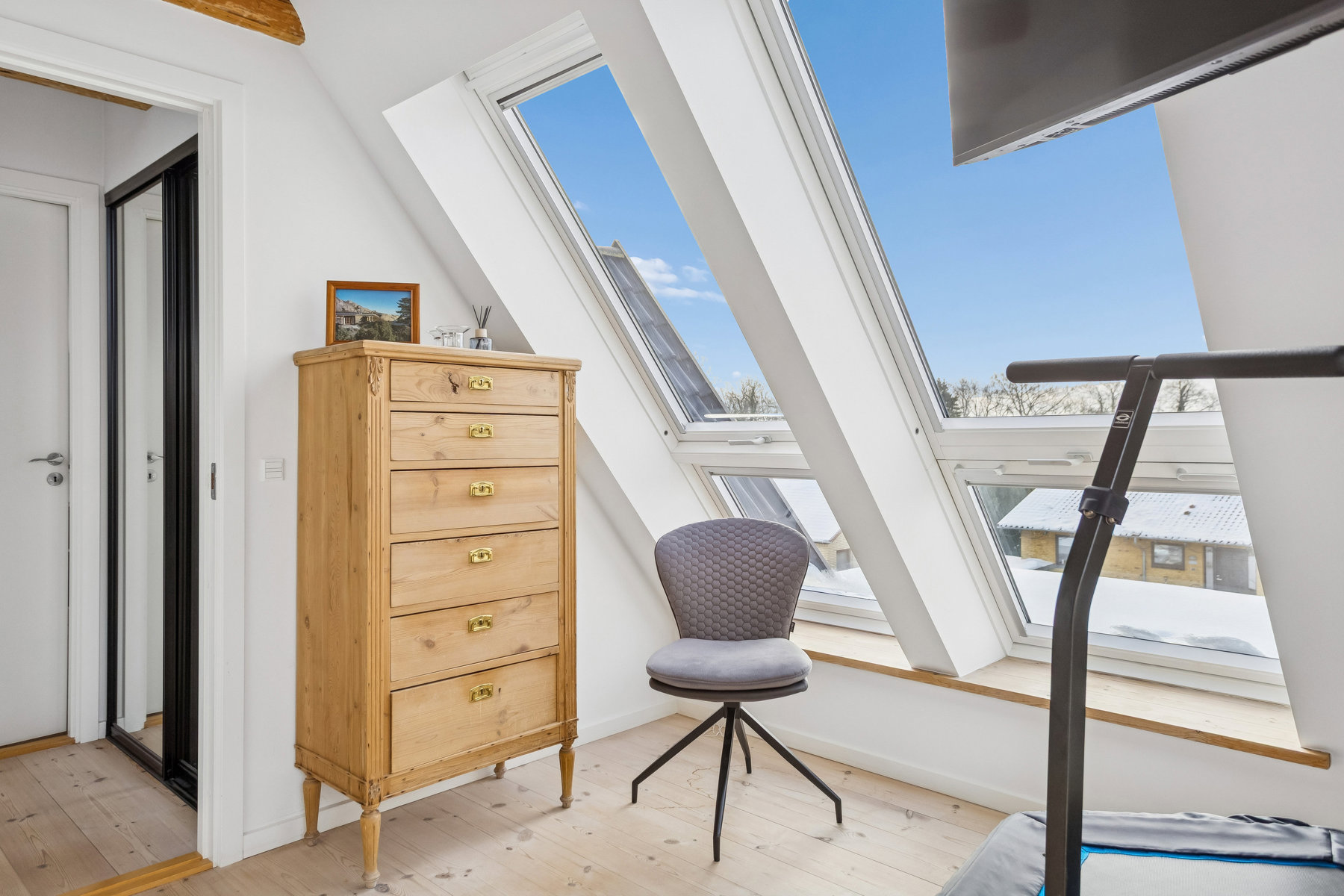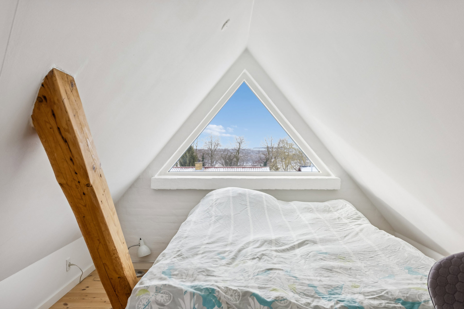 På 1. sal finder I tre gode værelser. Fra soveværelset er der tagaltanvindue, som giver mulighed for at ”træde ud” og nyde den imponerende udsigt over vandet og området. Der er desuden mulighed for at etablere en skøn tagterrasse på det flade tag over køkkenet – her kan udsigten for alvor komme til sin ret.