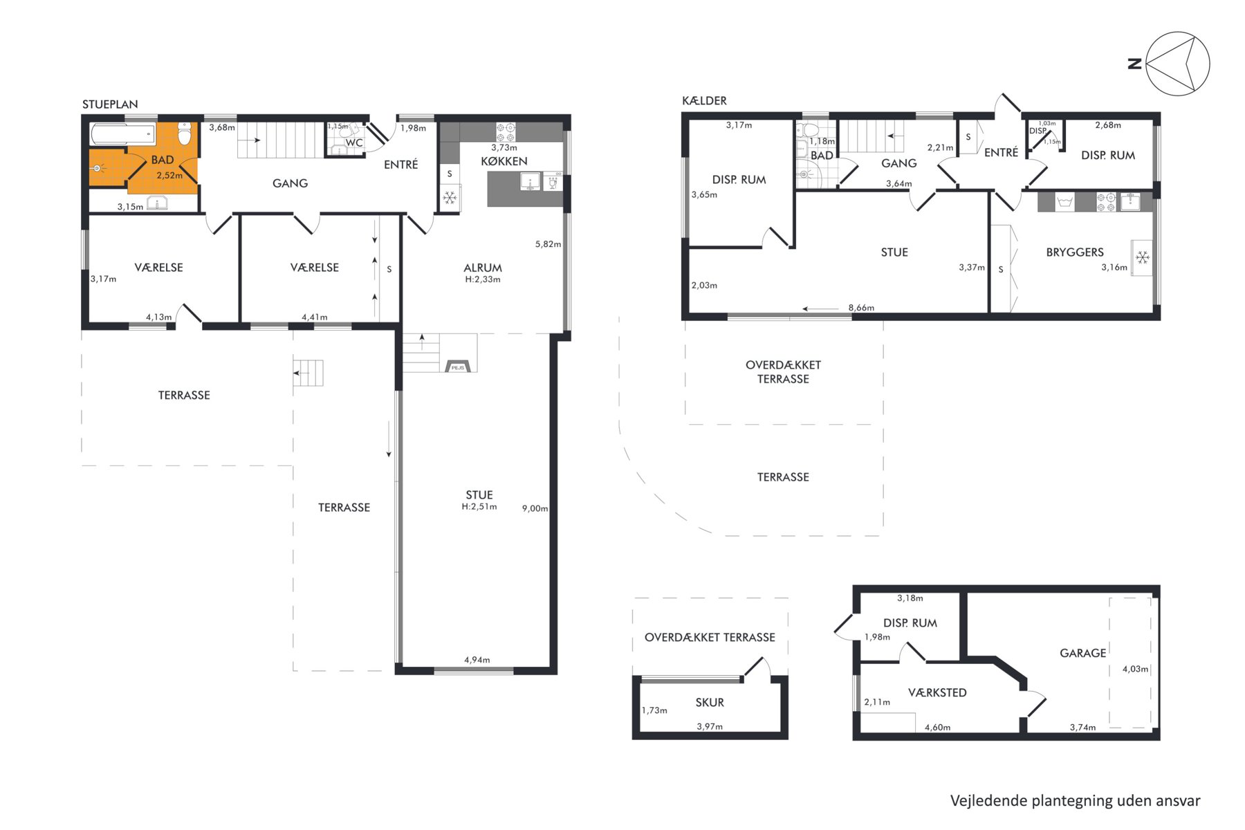 Stueetagen rummer desuden to rummelige soveværelser, hvoraf det ene har direkte udgang til endnu en terrasse, et stilfuldt badeværelse med badekar og gulvvarme, et gæstetoilet samt en entré/gang med lyse klinker og trappe til kælderen. Kælderen byder på en stor stue med mange anvendelsesmuligheder, et ekstra badeværelse, et rummeligt bryggers med god opbevaringsplads, en entré og tre disponible rum. Her er niveaufri udgang til haven og en overdækket terrasse, så kælderen føles som en naturlig forlængelse af boligen.
