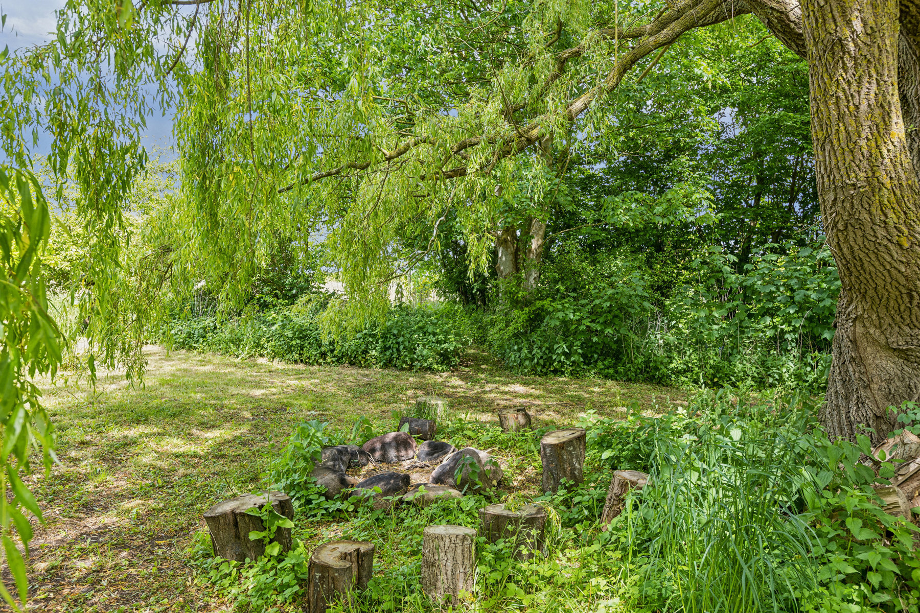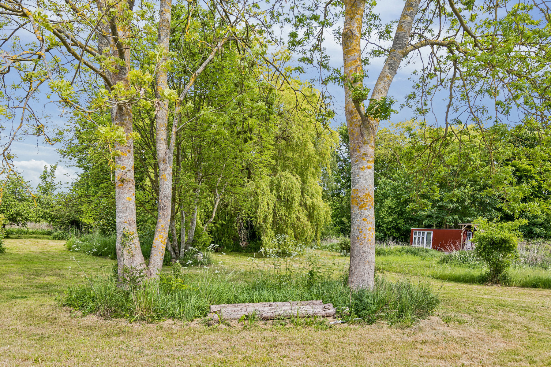 Grunden er rigt beplantet med høje træer, græs- og engområder, og dens størrelse giver mulighed for udendørs aktiviteter af enhver art. Vil I holde dyr, eller vil I have en stor køkkenhave, og se om I kan blive selvforsynende med frugt og grønt. Prøve at gøre Bonderøven kunsten efter? Der er også flere store udhuse på grunden, som eksempelvis kan tjene som værksted, hobbyrum eller bruges til opbevaring.